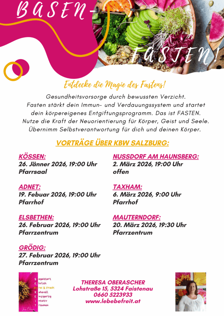 Entdecke, wie du deine körpereigene "Müllabfuhr" aktivierst und dich rundum wohler fühlst. Im Vortrag erhältst du fundiertes Wissen, um Basenfasten selbständig umzusetzen - ergänzt durch einfache Körperübungen zur Stressreduktion. Basenfasten unterstützt den natürlichen Reinigungsprozess in deinen Körperzellen. Basische Ernährung, viel Wasser, Bewegung und frische Luft fördern den Fastenstoffwechsel. Für mehr Energie, Gesundheit und neue Leichtigkeit im Alltag!